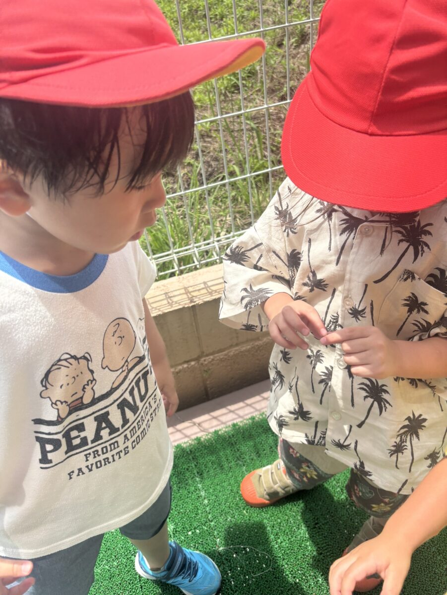 「あ!カタツムリ見つけた!」と小さなカタツムリを見つけ、興味津々のお友達でした♡