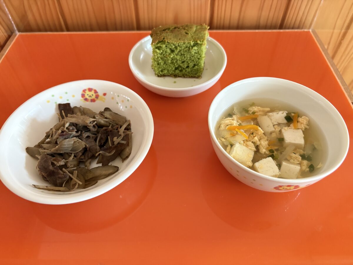 8月27(水)「牛肉のしぐれ煮・かき玉汁」おやつ「ほうれん草ケーキ」