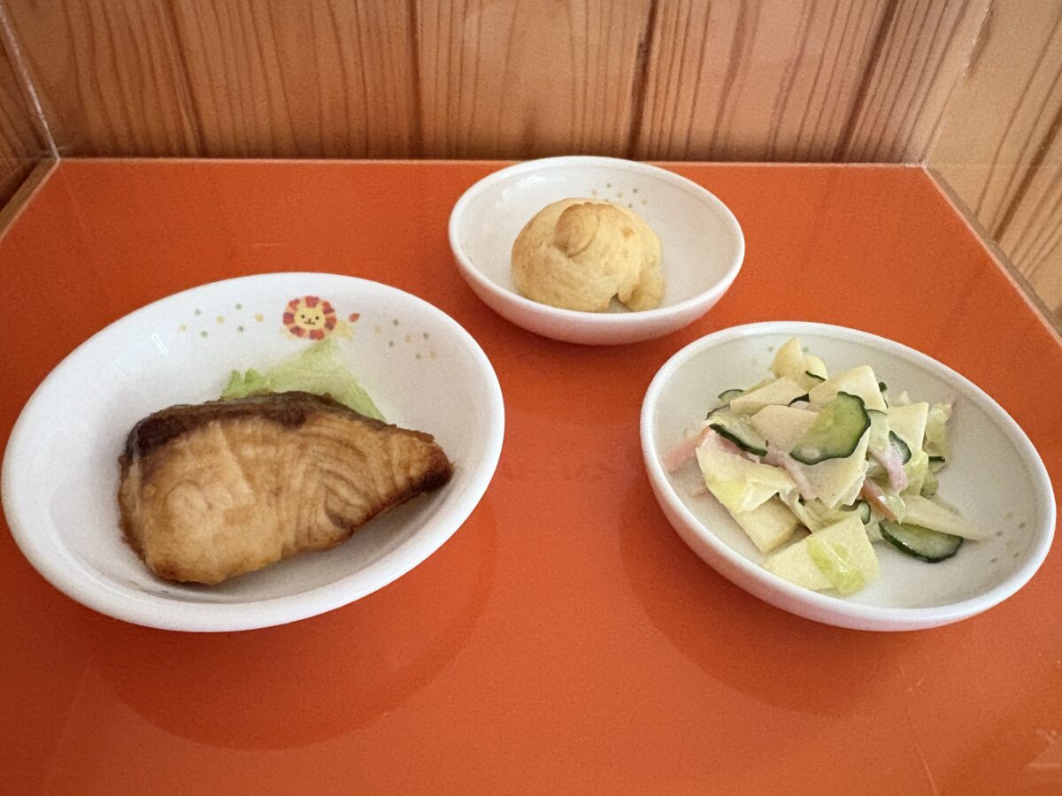 10月28日(火)「魚の蒲焼き・りんごサラダ」おやつ「バターシュガーパン」
