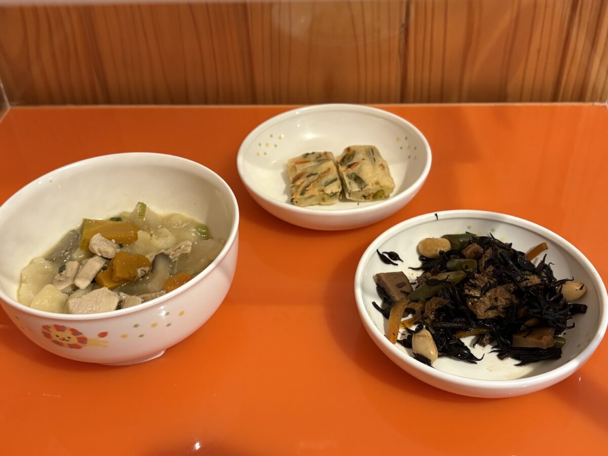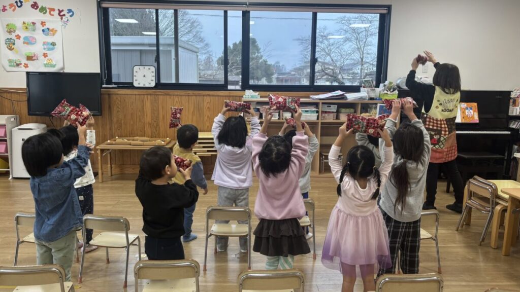 12月24日(水)「団子汁・ひじきの炒め煮」おやつ「ちぢみ」 今日の給食 2025.12.24 今日の1枚。 ダンス教室の田崎先生から、クリスマスプレゼントをいただきました。 「わぁ~!」と、とっても嬉しそうな子ども達でした♡