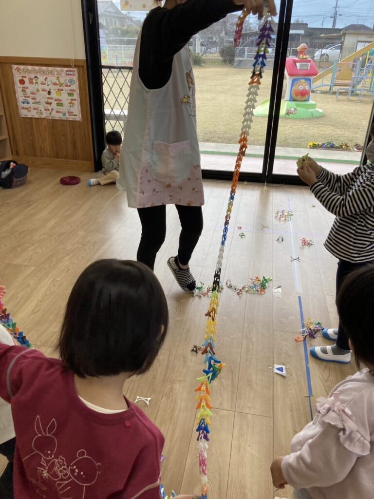「長くなったよー」と、保育者に手伝ってもらい、長さを確認する子ども達でした♪