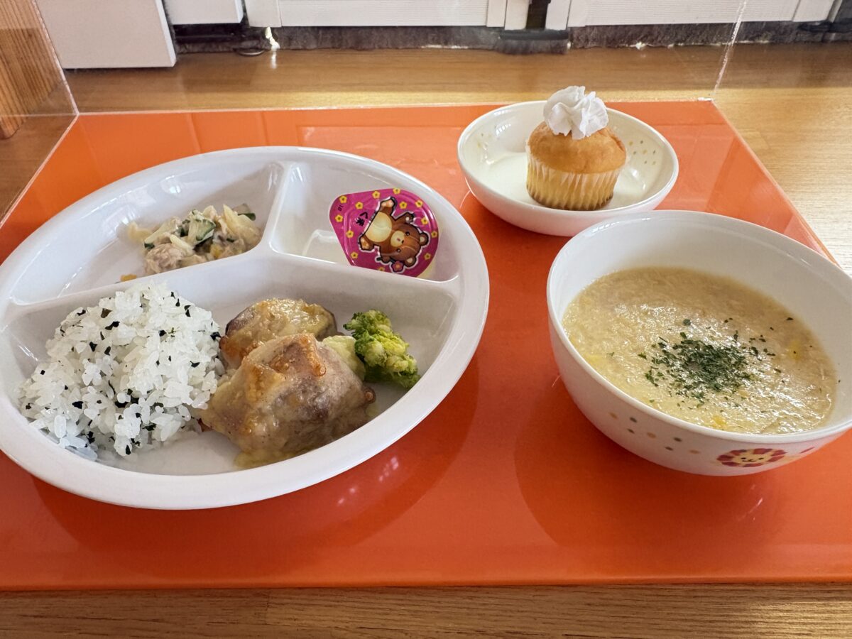 4月17日(月)「わかめごはん・鶏肉のチーズ焼き・ツナサラダ・スーミータン・ゼリー」おやつ「カップケーキ」 今日の給食 2026.04.17 20日(月)は、お弁当の日です。お弁当の準備をよろしくお願いいたします。 今日の1枚。 おやつのカップケーキに、「おいしい!」と、嬉しそうなお友達。ぺろり完食でした♪