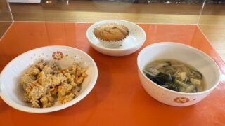 今日の給食 4月10日(金)「豚玉丼・味噌汁」おやつ「人参ケーキ」