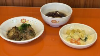 今日の給食 1月21日(水)「鶏肉の胡麻味噌焼き・マセドアンサラダ」おやつ「ぜんざい」