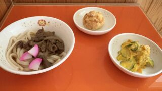 今日の給食 10月23日(木)「肉うどん・南瓜サラダ」おやつ「メロンパン」