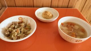 今日の給食 10月24日(金)「スタミナ炒め・カレースープ」おやつ「フレーククッキー」
