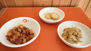 今日の給食 10月29日(水)「ポークビーンズ・切干大根の煮物」おやつ「チーズスカロップ」