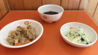 今日の給食 11月12日(水)「豚肉のカレー焼き・春雨サラダ」おやつ「ぜんざい」